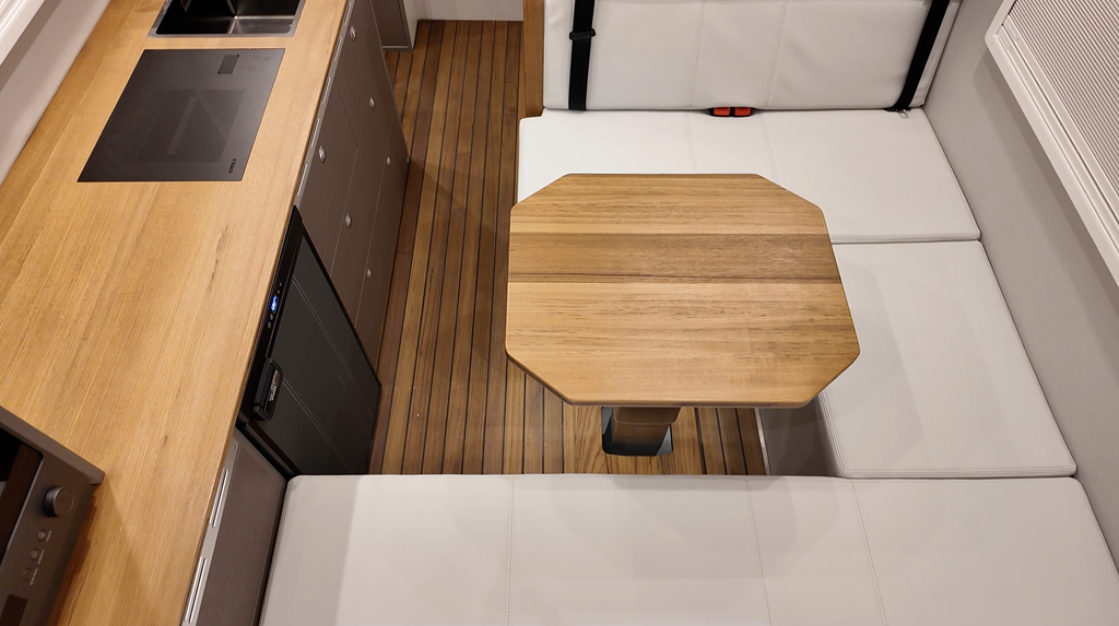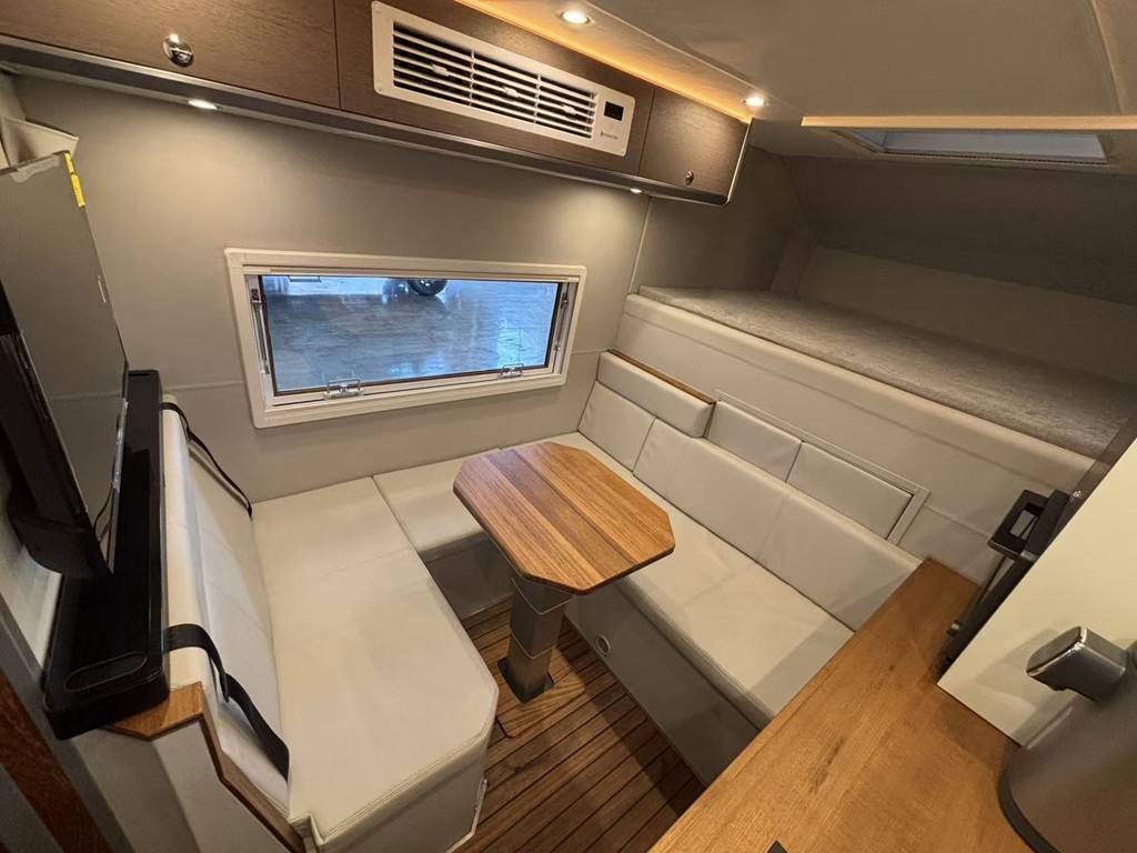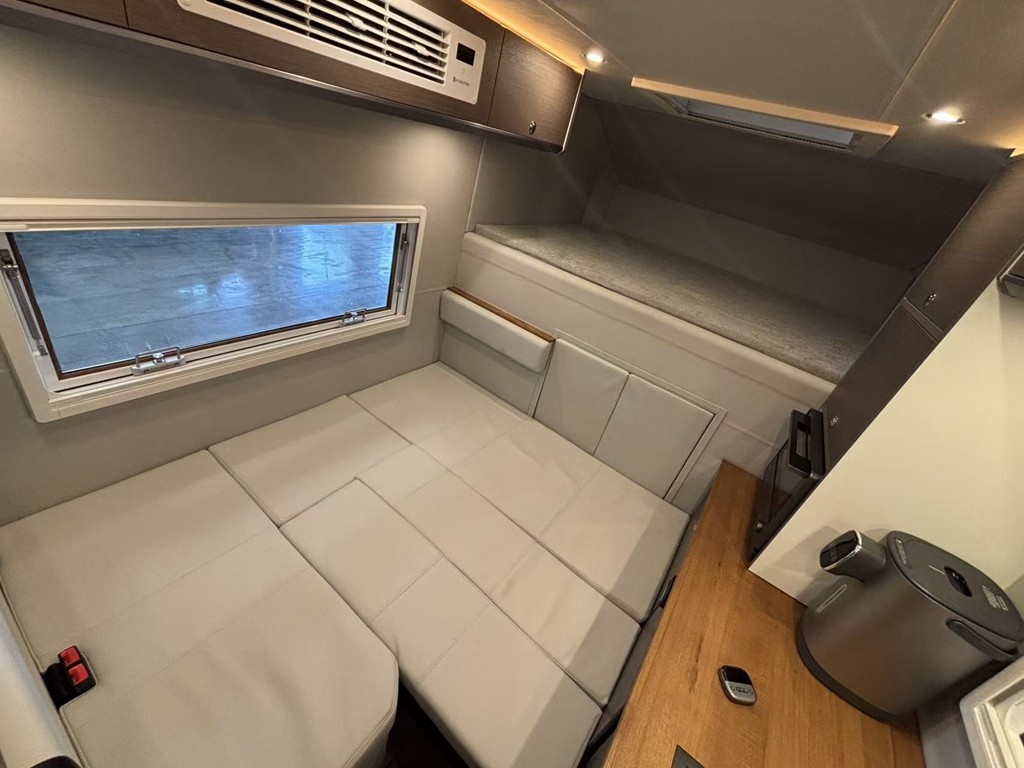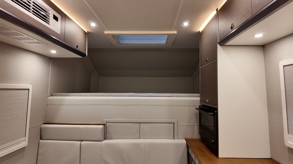 进入内部空间中,功能区域划分依然传承了旅美房车经典的会客厅、卧室、厨房、卫浴间等功能布局,升级的则是在细节打造方面。在卧室区域,2.1m*1.5m左右的大额头床,带来高质量的睡眠体验。会客区中柔软的双人对坐沙发到夜晚则可以变成1.2*1.9米左右的单人床,让一个空间兼具多个功能属性。值得一提的是,环绕车顶左右两侧的是储物吊柜,优质的实木面板和精致的做工,都彰显了旅美房车品牌的匠心特质,而冷暖变频空调很好的隐藏在其中,既能够发挥其制暖制冷的功能属性,又可以美化空间,增加车型内的美观度和空间舒适度,把更多生活空间留给车友。车顶部还有全景天窗,增加视野通透性和空间通风性。