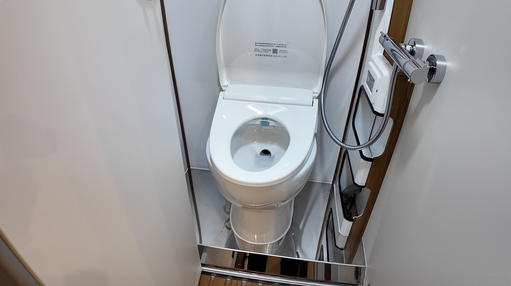 卫浴间部分,房车专用独立式淋浴间设计,配备进口美国 Maxxfan 正反转换气扇房车专用电搅碎马桶及智能马桶盖如厕时温暖的马桶盖感觉更舒适,还有清洗功能满足个性化需求。一体式淋浴花洒组合洗澡更便捷。想要清洗衣物,还有韩国进口 MINI可以使用。